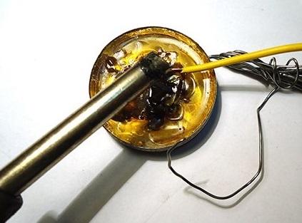 Нагретым паяльником следует разогреть подготовленные, тщательно зачищенные концы проводов, опустив их в канифоль. Надо чтоб канифоль хорошо обволокла провод.