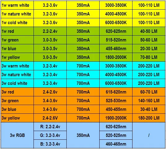 Красные светодиоды имеют максимальное номинальное напряжение 2,2 В, синие светодиоды имеют максимальное номинальное напряжение 3,4 В, а белые светодиоды имеют максимальное номинальное напряжение 3,6 В.