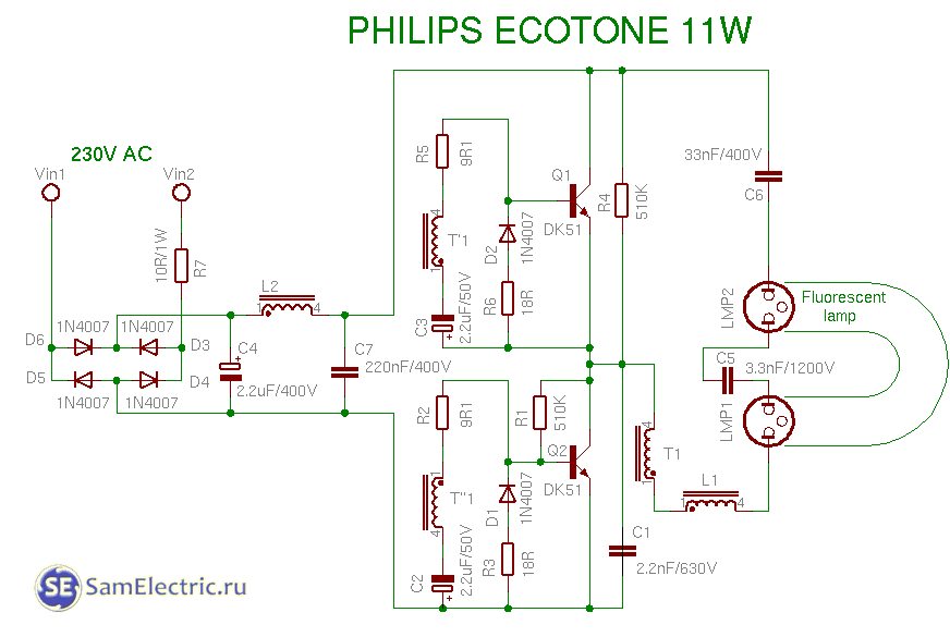 При перегорании спирали (обрыве нагрузки) электронный балласт также может выйти из строя, поэтому следует проверить его компоненты, следуя по пути прохождения тока. Будет целесообразно скачать схему данного светильника, но, его можно отремонтировать, разбираясь в обозначениях на самих деталях и плате.